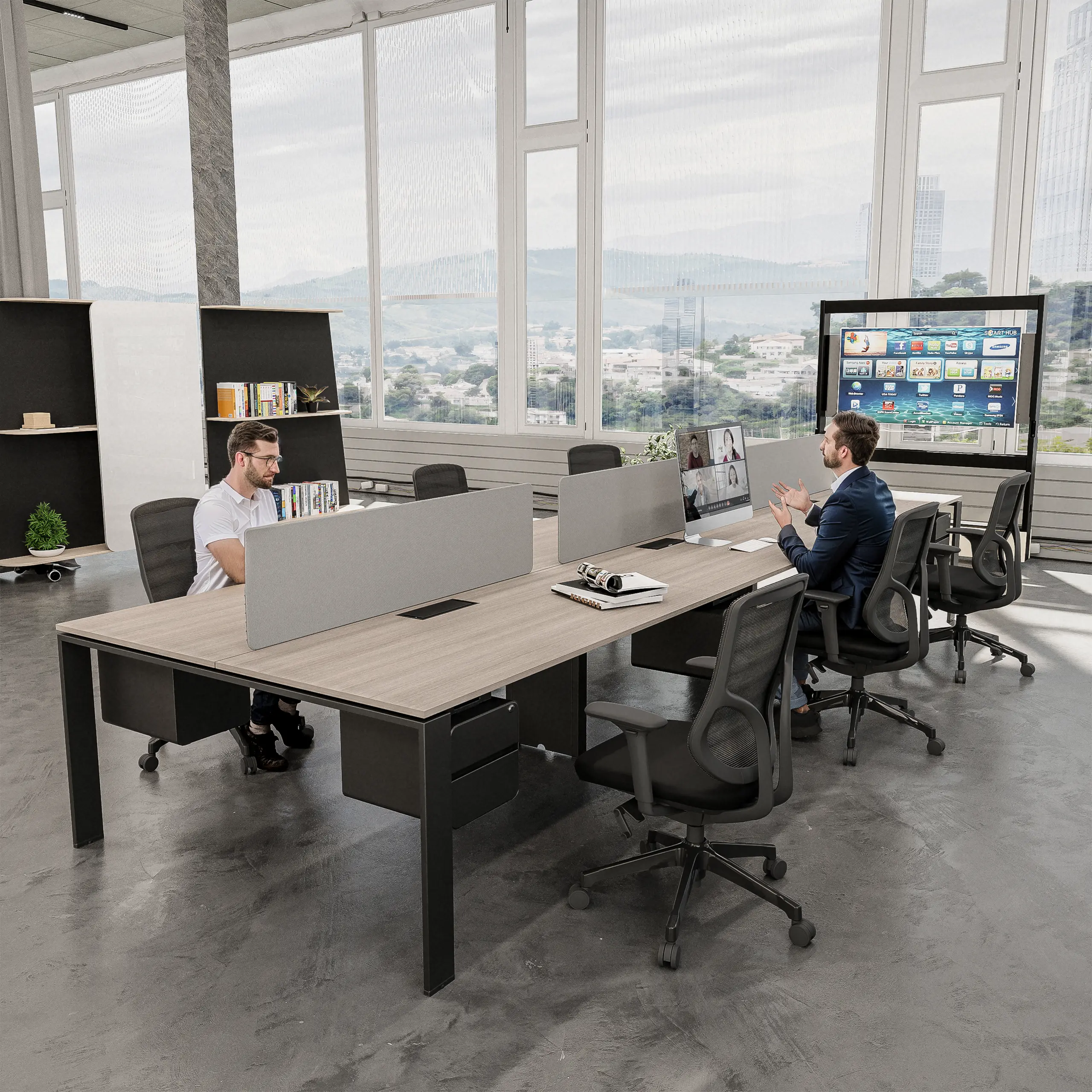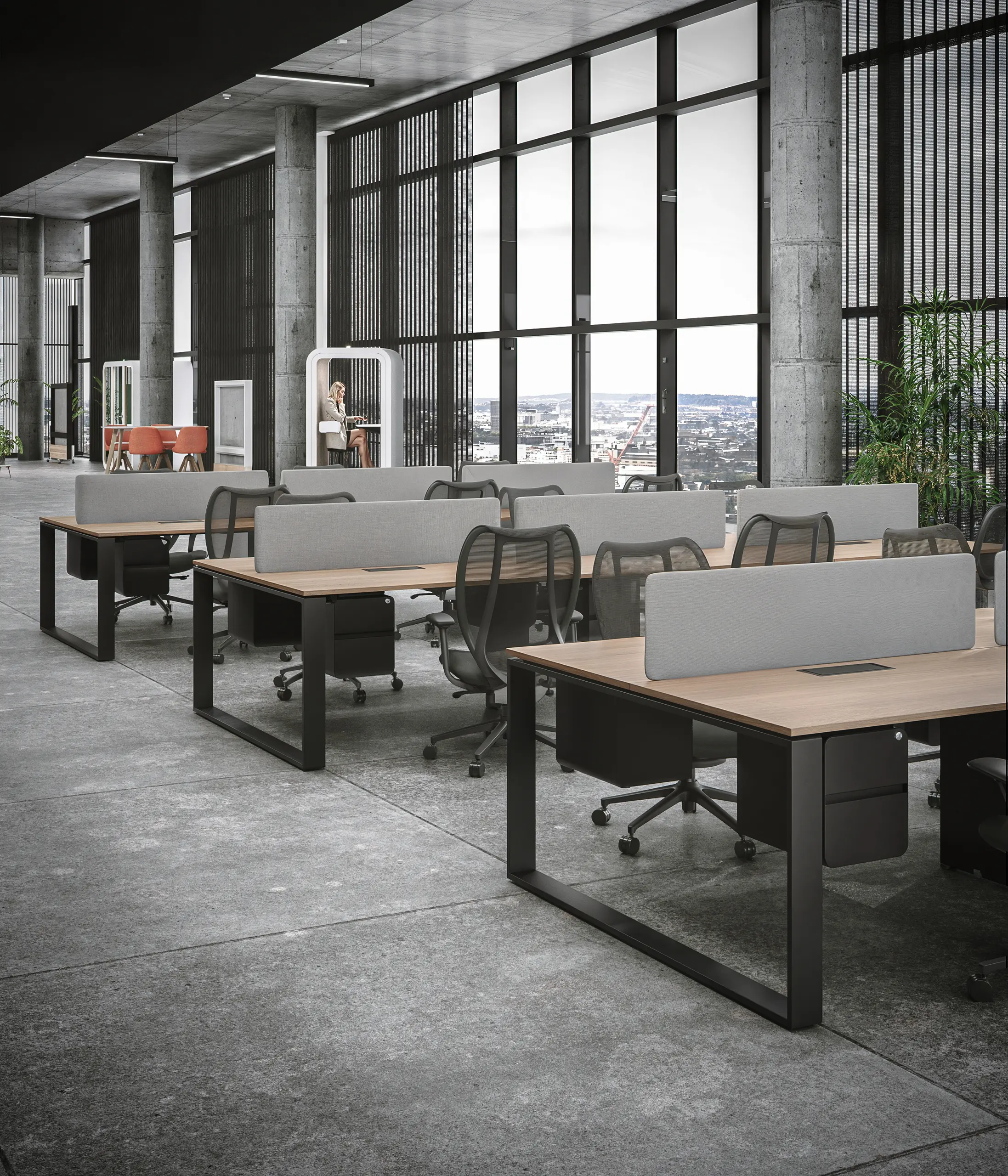 The Eco Series offers a modern and contemporary solution for office workstations and desks, combining a unique design that enhances both aesthetics and functionality. Its specific form promotes an open, airy atmosphere, making it perfect for focused individual work as well as dynamic collaborative environments.